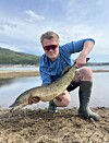 – Først så vi en skygge nede i dypet, men den ble plutselig bort igjen. Først så det ut som en stor ørret, for det var ikke før den var ca. to meter fra båten at vi skjønte hvor stor den var. Den hang i garnet etter kjeften så jeg var redd for at den skulle falle av, men da vi fikk den opp i båten ble det stor jubel blant noen, og skrekkblandet fryd hos barna. Femåringen syns det var så skummelt at vi måtte sette henne av hos bestefar på land, sier Skjøstad.