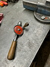Jon sitter med en liten hånddrill i hendene - et verktøy som bærer preg av mange års bruk. Trehåndtaket er glatt og avrundet - formet av hender som har holdt det mang en gang. Rødmalingen på tannhjulet er delvis flasset av, men ellers er drillen godt vedlikeholdt. Trolig fungerer det like godt i dag som da det ble kjøpt for 72 år siden.