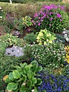 Steinbedet står i en skråning, og det krever en del planlegging for å få alle plantene til å fungere som de skal.