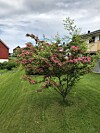Høyder og farger på plantene koordineres i bedet til et gledelig samspill. Blomsterpotter blir bolig for fargerike venner, og påskeliljer blomstrer midt på plenen. I tillegg står det trær som rosehagtorn og syriner andre steder på eiendommen.