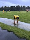 Og ja, kampen minnet mer om en vannpolokamp enn en vanlig fotballkamp. Polo – fordi det nesten bare var mulig å pole ballen, da den ikke ville trille langs bakken i alt vannet som hadde lagt seg. Det hele førte til knall og fall, umulige pasninger og rett og slett umulige forhold for gjennomføring av en fotballkamp. Det hele endte med 0-4 til Lånke 2. En oppgitt trener, Jarle Overvik, hadde følgende å si etter det han kaller for en parodi av en fotballkamp.